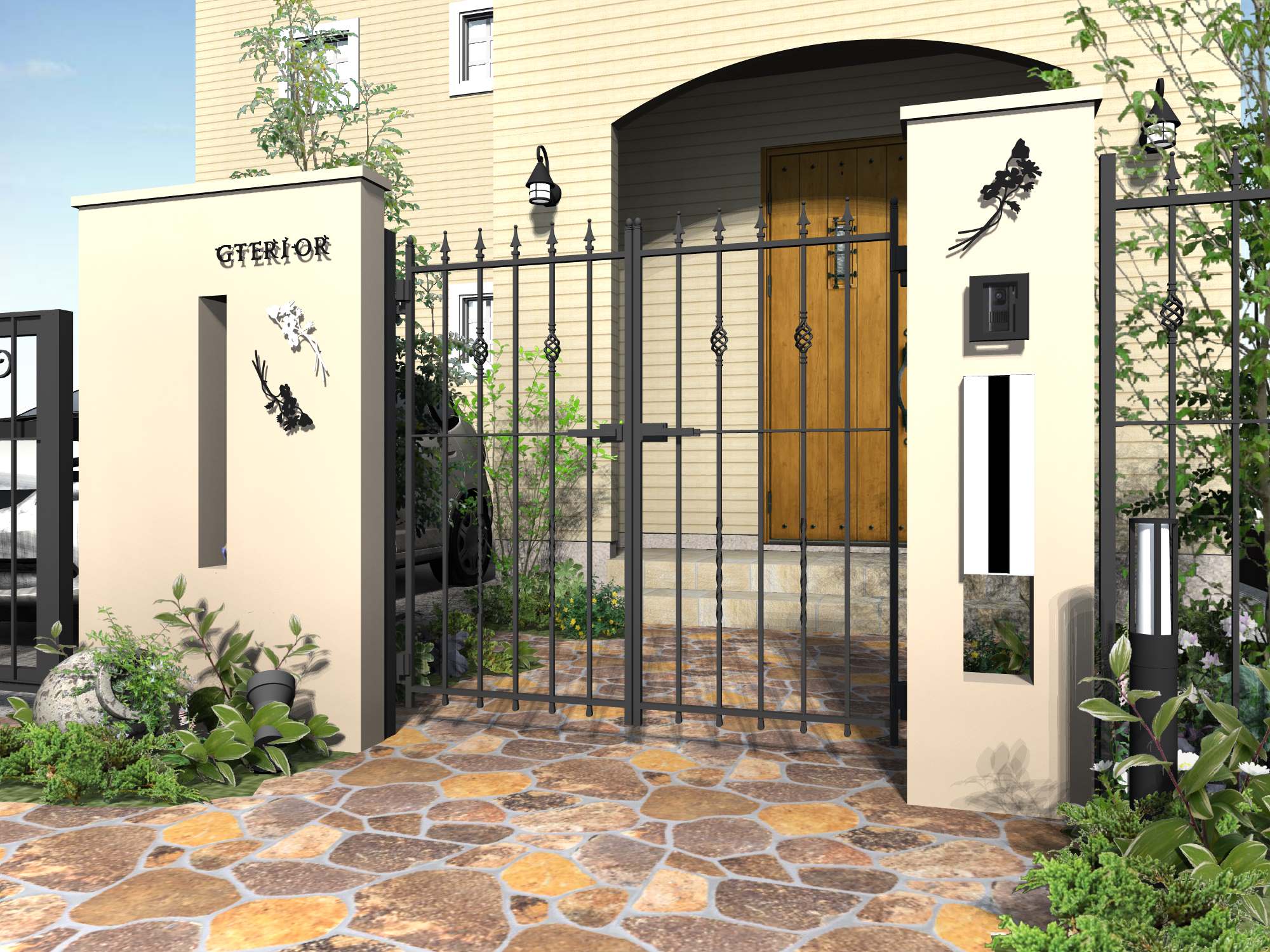 アルミ鋳物製の門扉・フェンスを使ったクローズスタイルエクステリアです。全体的に落ち着いた高級感のある雰囲気となります。上記プラン例 参考価格300万円程度。