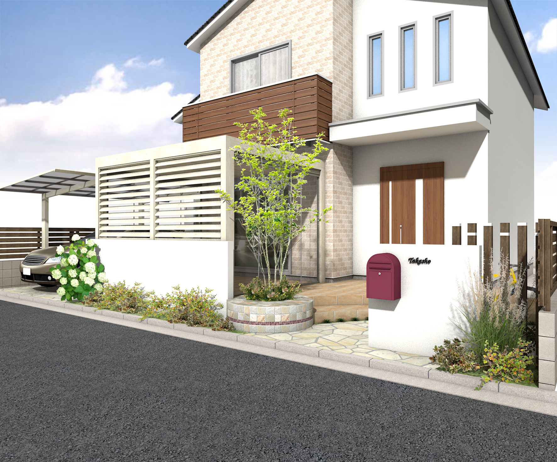 開放的なオープンスタイルは、独立して門柱やカーポートなどが配置されがちですね。その為に住宅の玄関ドアや外装色、外装タイルなど、お住まいのお洒落ポイントをエクステリアにもアレンジすると、お住まいとグッドマッチしたエクステリアが出来上がると思います。上記プラン例 参考価格150万円程度。