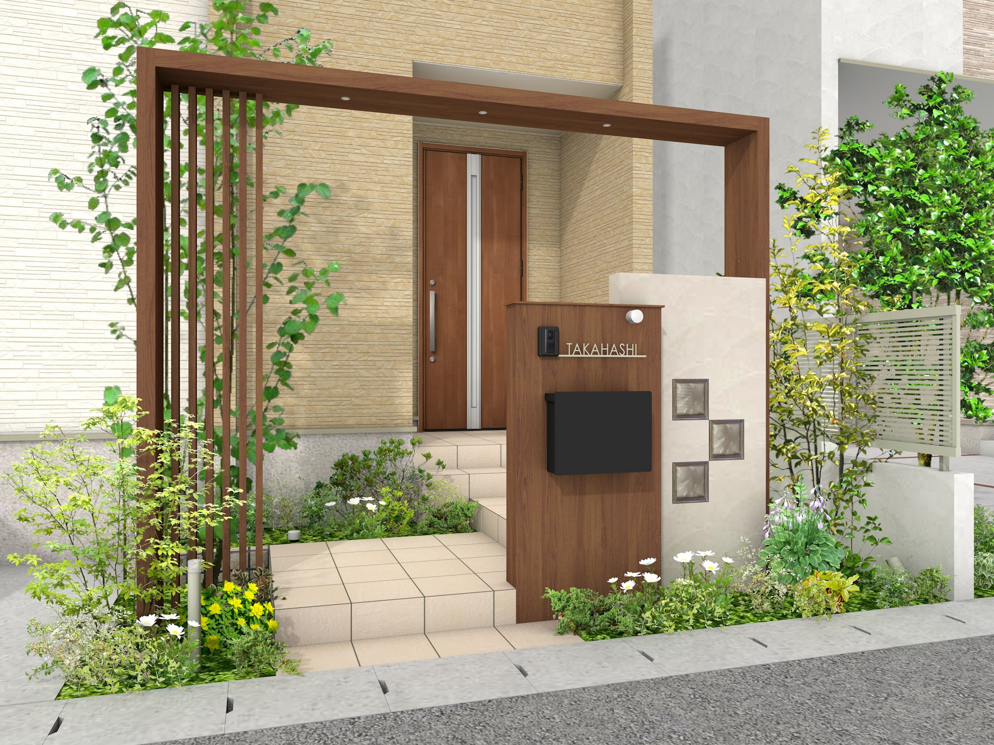 そして、ちょっとひと工夫!より立体的な高さのある、お洒落素材を加えると益々玄関周りの印象が引き立ちますね!上記プラン例 参考価格200万円程度。