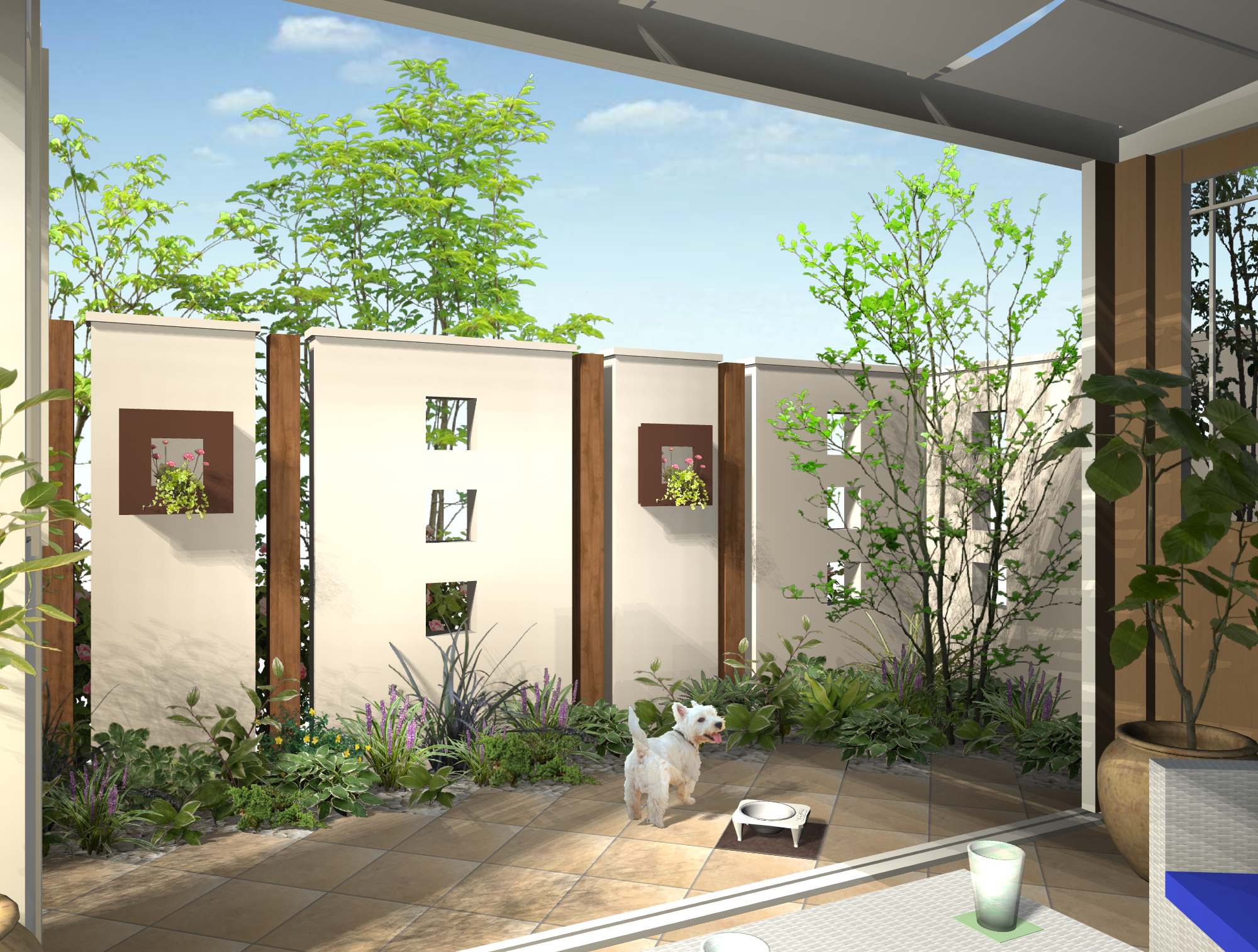 休日は家族パーティ、バーベキューを楽しむ庭。上記プラン例参考価格 エクステリア部分250万円+植栽工事部分50万円 合計300万円程度。