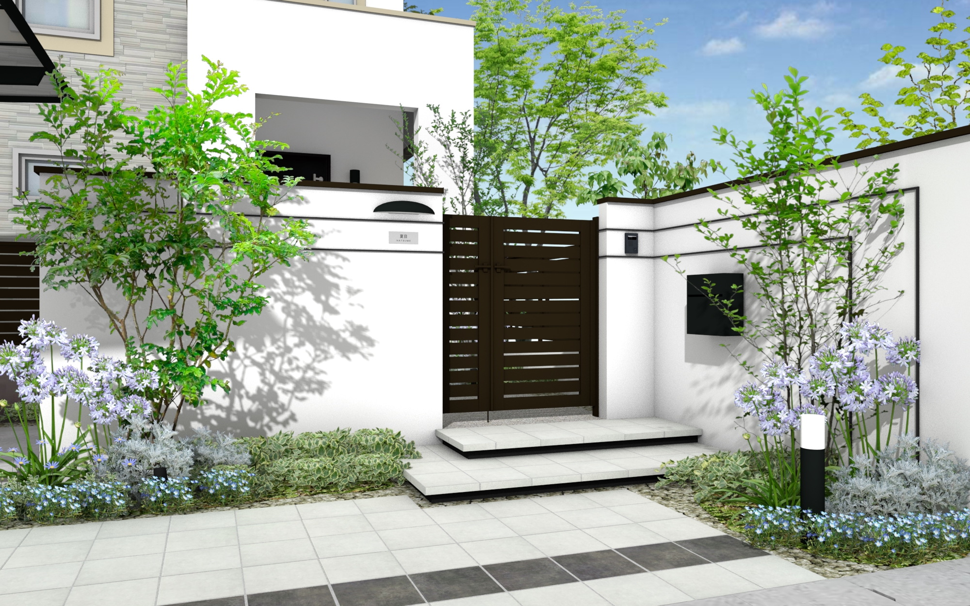 クローズスタイルの門周りを柔らかな雰囲気にするナチュラルな植栽。上記プラン例参考価格 エクステリア部分200万円+植栽工事部分50万円 合計250万円程度。